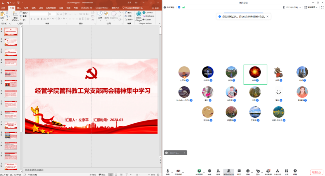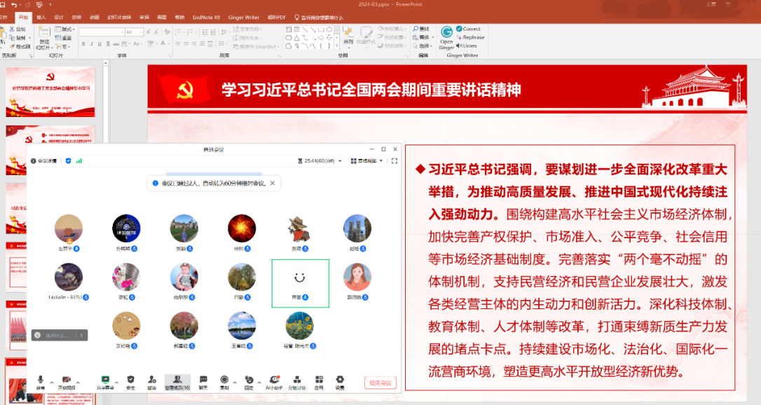 3月7日至3月20日,全体党支部分别开展了支部集中学习研讨会,学习宣传贯彻全国两会精神。支部党员还结合自身实际,围绕对两会高频词的理解、学生党员应该怎么做、新型生产力的发展与科研教学实践紧密结合等主题,就如何将两会精神转化为推动工作发展的强大动力进行了深入讨论,以实际行动践行初心使命。支部书记要求党员要切实将“两会精神”转化为砥砺奋斗的思想源泉和行动力量,对全国两会重要精神要再次进行自学。