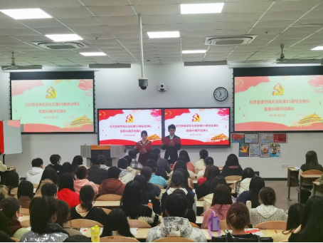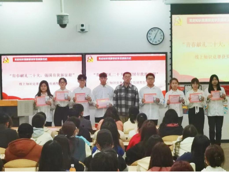 第二项,优秀学员表彰及颁发证书。由工商第二学生党支部书记奚姝美和工商第四学生党支部书记石慧敏为获奖学员颁奖并合影留念。典礼第三项,党史线上知识竞赛获奖学员颁奖仪式。由工商第三学生党支部书记侯剑波为获奖学员颁发奖状和奖品。随后,优秀学员代表蔡静上台发言。她表示,经过党课班系统的学习,明确了如何以党员的标准去严格要求自己,她将做到从思想上入党,争取早日成为一个合格的共产党员。