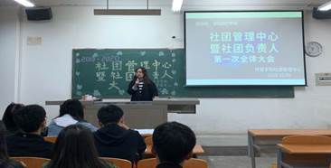 首先,由各社团负责人进行自我介绍,并简要说明本学期工作计划。接着,由社团管理中心各部长进行自我介绍,并说明部门主要工作职责。新部员也从专业、爱好、特长等方面进行精彩的自我介绍,与对接社团进行有效沟通。最后,社团管理中心主席杨文霞对接下来的工作提出了几点要求,并进行相关培训。