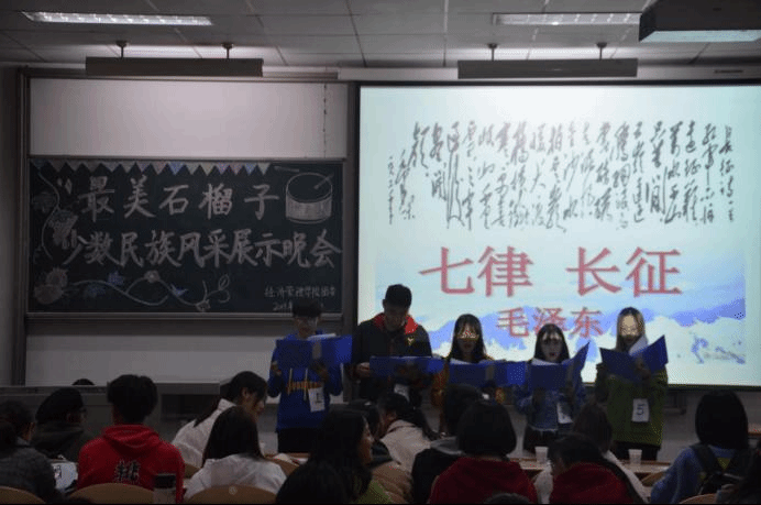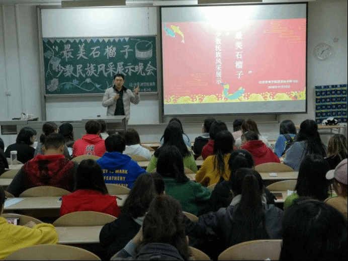 活动开始,侯老师发表讲话,他说“最美石榴籽寓意各民族同学都能像石榴籽一样紧紧抱在一起,希望本次活动可以为少数民族同学们提供一个交流学习的平台。”随后,主持人刘宸希介绍了本次活动的要求及评分细则。比赛正式开始。身穿民族特色服饰的藏族同学伴着欢快的歌声为大家带来了一组精美绝伦的开场舞蹈展示。接下来,各民族混搭组的同学依次为观众们带来《长征魂》、《家和万事兴》、《高原上的小茶花》、《祖国在我心中》等经典篇目的朗诵,他们表情专注、感情充沛。随着高昂的音乐,他们一齐诵出“我亲爱的祖国啊,我们爱你”。之后,比赛进行到规定篇目的朗诵环节,由二十多名选手为观众们带来了的《我爱这片土地》将整个比赛推向了高潮。