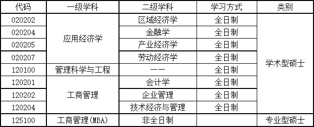 学院现有管理科学与工程、工商管理和应用经济学3个一级学科硕士点授权点,工商管理硕士(MBA)、会计专业硕士(MPAcc)和物流工程与管理(MEM)3个专业硕士学位授予点。