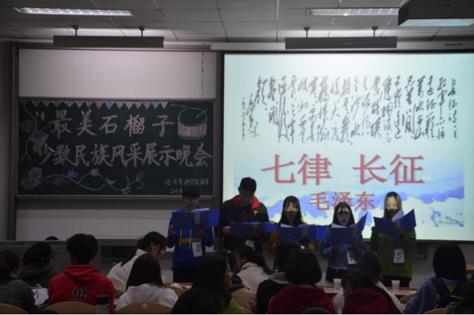 活动开始,侯老师发表讲话,他说“最美石榴籽寓意各民族同学都能像石榴籽一样紧紧抱在一起,希望本次活动可以为少数民族同学们提供一个交流学习的平台。”随后,主持人刘宸希介绍了本次活动的要求及评分细则。比赛正式开始。身穿民族特色服饰的藏族同学伴着欢快的歌声为大家带来了一组精美绝伦的开场舞蹈展示。接下来,各民族混搭组的同学依次为观众们带来《长征魂》、《家和万事兴》、《高原上的小茶花》、《祖国在我心中》等经典篇目的朗诵,他们表情专注、感情充沛。随着高昂的音乐,他们一齐诵出“我亲爱的祖国啊,我们爱你”。之后,比赛进行到规定篇目的朗诵环节,由二十多名选手为观众们带来了的《我爱这片土地》将整个比赛推向了高潮。