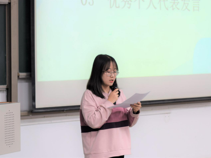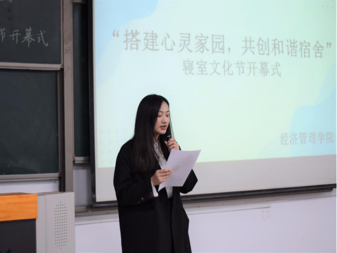 开幕式伊始,王传宇对学院各学科宿舍评比活动进行了详细介绍,并对优秀寝室进行照片展示。紧接着,优秀寝室长代表梁艳娇上台发言,她讲到维持一个良好的宿舍环境和优秀的学习氛围,离不开每一位同学共同的努力,有一份耕耘才有一份收获。随后,寝室优秀个人代表霍子怡表示团结友爱的宿舍氛围是靠用心付出来培育的,积极向上的宿舍文化是靠美德和智慧去营造的。最后,许金鑫对本次寝室文化节开幕式进行了总结。