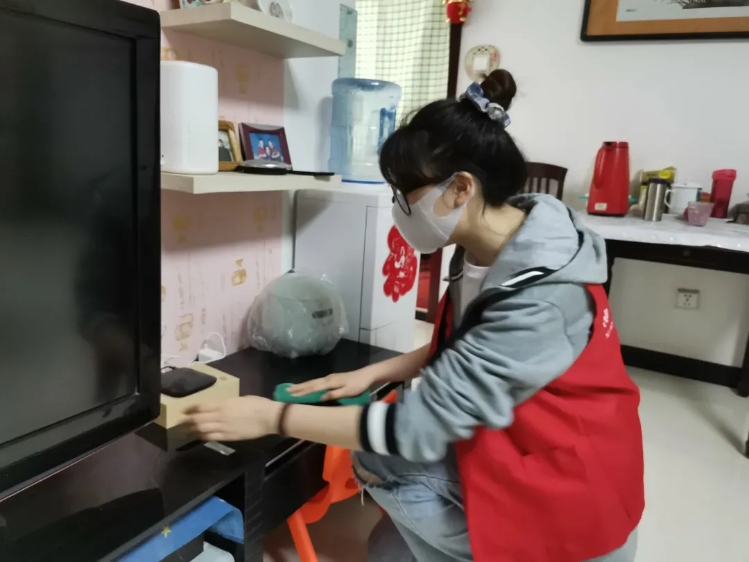 第一组志愿者进到独居老人家里,帮助老人打扫卫生,清洁卫生死角。老人们平时独自生活,上了年纪不便打扫,在志愿者们的清洁下,老人家里的环境更加干净整洁。