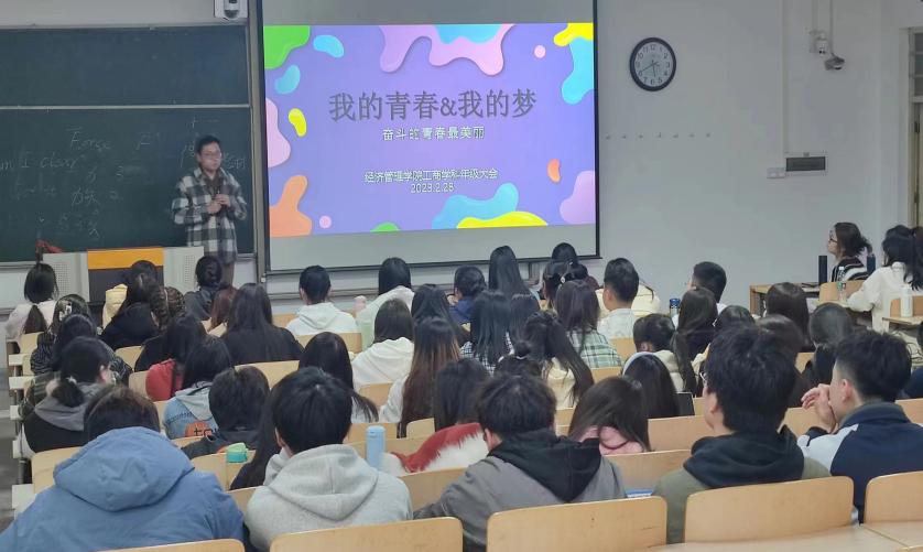 梦想渐行渐近的步伐,离不开无悔的青春奋斗。会上,崔弘和侯剑波以分析当下大学生发展状况为出发点,结合今年考研现状以及历年毕业生求职经历和经验,对21级经管同学职业生涯规划进行指导,鼓励同学积极参加学科竞赛和社会实践活动,努力争取实习机会,丰富自己的履历。